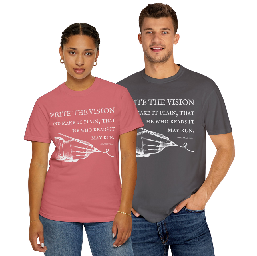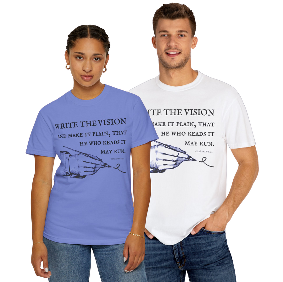 It was too hard to decide between the design in black or the design in white, so we decided to bring you both. We think the white adds a unique glow that makes it feel extra special—and especially apropos for those who positively burn with inspiration!One of the most loved scriptures for Christian writers everywhere, Habukkuk 2:2 is a powerful exhortation for anyone carrying a message from God.We are in love with the rich hues of these 100% cotton tees from Comfort Colors. It just might be the perfect combination of cozy softness and durability. Better yet, they are made with only 100% ethically grown & harvested cotton.This design features a WHITE DESIGN, available in six colors: Black, Graphite, Blue Jean, Bay, Berry, and Mustard.Our white design is featured in the listing below.Small-XL | $29. + shipping